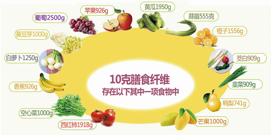 注意:膳食纤维吸水膨胀过后,体积和重量会增加到10-15倍,减少食物中脂肪的吸收,达到控制体重和减肥的目的。